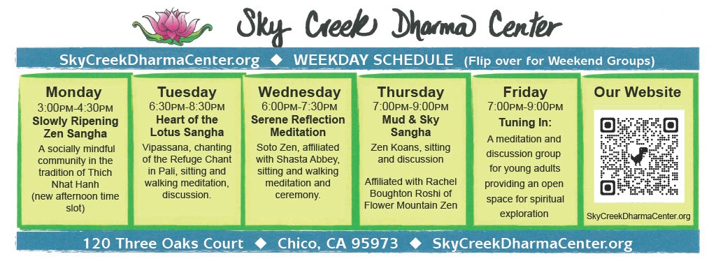 Want to learn more about the center, how our groups work, and other things we do here? Have other questions? Email us at admin@skycreekdharmacenter.org or leave a voicemail at (530) 592-4288 and we can call you back. Be sure to add yourself to our mailing list!