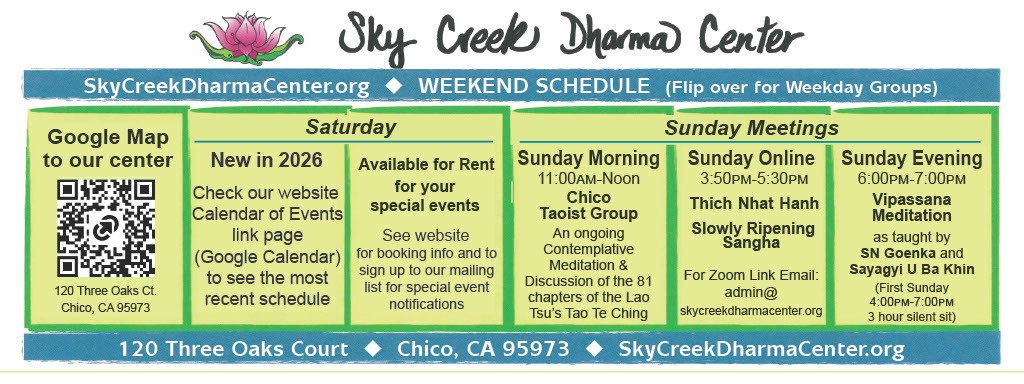 A non-profit, donation-based meditation center in Chico shared by peer-led Buddhist and Taoist meditation groups since 2004.